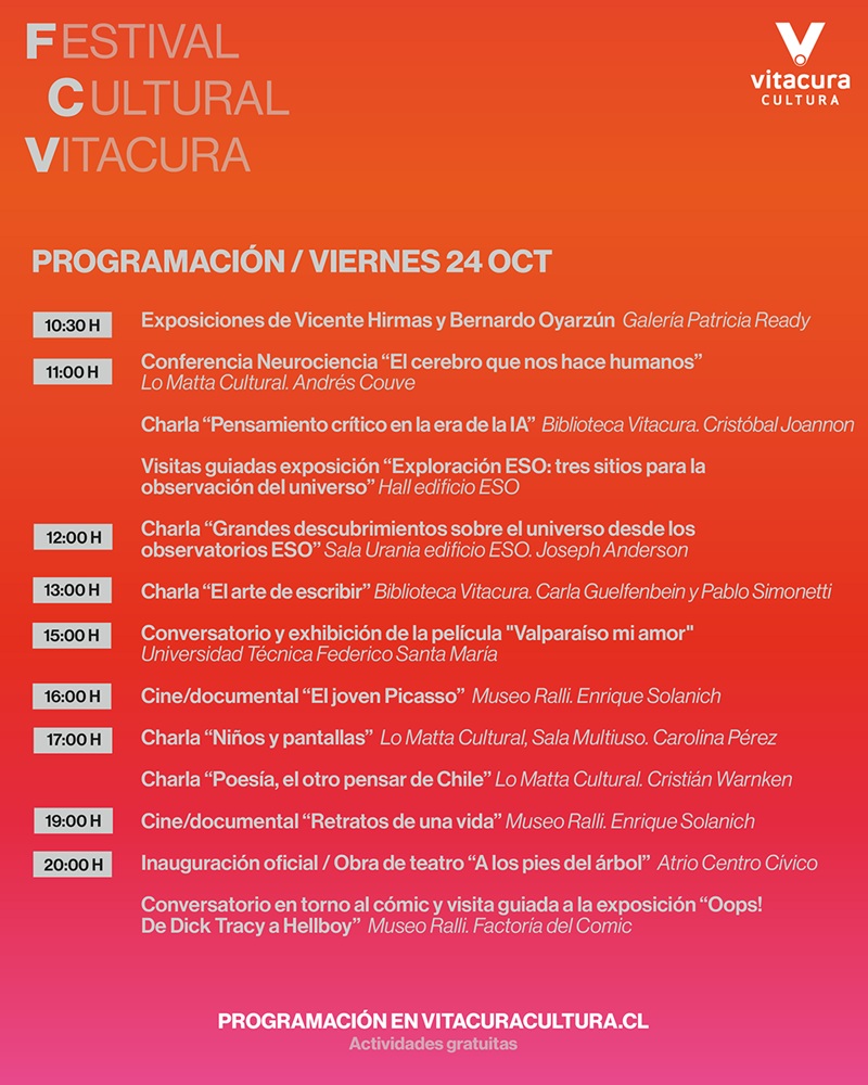 Un lugar para el desarrollo del pensamiento, la reflexión y la creatividad a través de la cultura, propone el nuevo Festival Cultural de Vitacura que se desarrollará el próximo viernes 24 y sábado 25 de octubre: Charlas, teatro, cine, talleres, música, exposiciones e intervenciones se desplegarán en museos, parques, plazas y centros culturales de la comuna, en un evento en el que las artes, se desplegarán en diferentes escenarios y de manera simultánea.