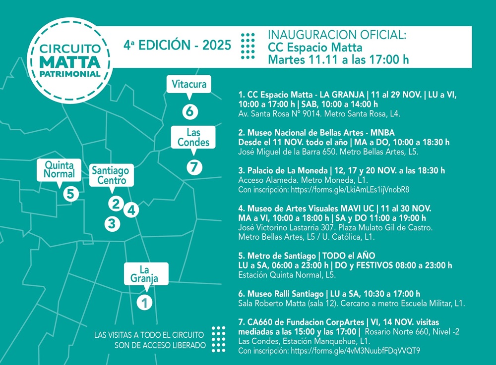 El Circuito, creado en 2022 por la curadora Inés Ortega-Márquez, busca acercar el arte y el pensamiento de Matta a las personas y a las comunidades, promoviendo una experiencia abierta, descentralizadora y gratuita a lo largo de todo el mes de noviembre. La programación incluye exposiciones, conversatorios y actividades que invitan a reinterpretar el legado de Matta desde una mirada latinoamericana, conectando su visión humanista y su espíritu creativo con los desafíos actuales del país.